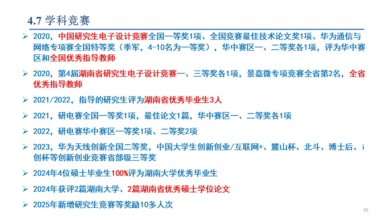 作为指导教师获得研究生电子设计竞赛全国一等奖(前1.4%)2项、二/三等奖各1项,全国研电赛最佳技术论文(前0.3%)2篇,华为通信与网络竞赛全国特等奖1项、天线创新赛全国二等奖1项、射频挑战赛全国三等奖2项,景嘉微杯电子设计竞赛全省特等奖1次,研电赛华中赛区一等奖7项、二等奖10多项,湖南省研电赛一/三等奖各1项、二等奖4项,全国学术会议优秀论文奖4项,湖南省电子学会优秀论文一等奖1项,互联网+/博士后/北斗应用/麓山杯/i创杯等创新创业大赛省部级奖励10多项,被评为全国优秀指导教师2次、湖南省优秀指导教师1次,九游会j9官网登陆入口创新创业优秀导师,指导的研究生被评为湖南省优秀毕业生7人,获湖南省优秀学位论文2篇、九游会j9官网登陆入口优秀学位论文4篇。