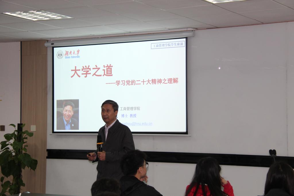 深入学习宣传贯彻党的二十大精神,充分发挥“五老”亲历者、见证者、实践者的优势,教育激励广大青年学生在新征程上立志做有理想、敢担当、能吃苦、肯奋斗的新时代好青年,是工商管理学院学工和团委推进思政大课堂的一项重要举措。5月10日晚,学院教授陈收应邀给辅导员和学生代表主讲“大学之道——学习党的二十大精神之理解”。陈收以作为学生干部,是否具备较高的学习能力、是否对问题具备敏感度、是否在研究工作中具备意志力...