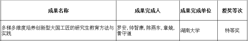 依据《第十二届湖南省高等教育教学成果奖评审奖励实施办法》,报经湖南省人民政府批准,我校申报的《多梯多维度培养创新型大国工匠的研究生教育方法与实践》,被评为省级高等教育教学成果特等奖。