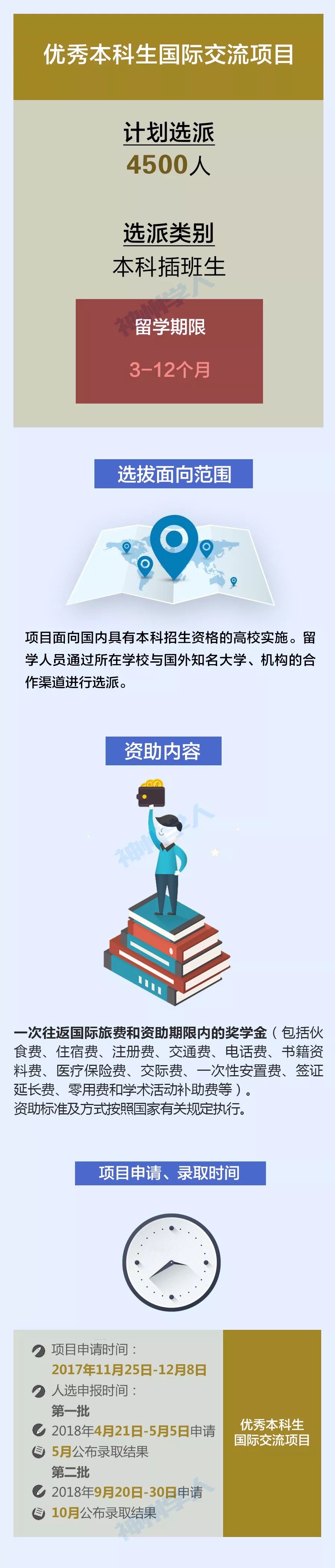 为进一步推动国内高水平大学与世界知名大学和机构的合作,促进多元文化交流,提高学生的创新意识、实践能力和国际竞争力,满足国家急需专业、学科领域高素质国际化人才培养需求,设立并实施优秀本科生国际交流项目。通过支持国内高校与国外知名大学、机构的合作渠道,选派国内在读本科生赴国外进行课程学习、毕业设计或赴国际组织/企业/实验室实习。2018年优秀本科生国际交流项目计划选派4500名本科二年级(含)以上优秀本科生出国留学,选派类别为本科插班生,留学期限为3-12个月。