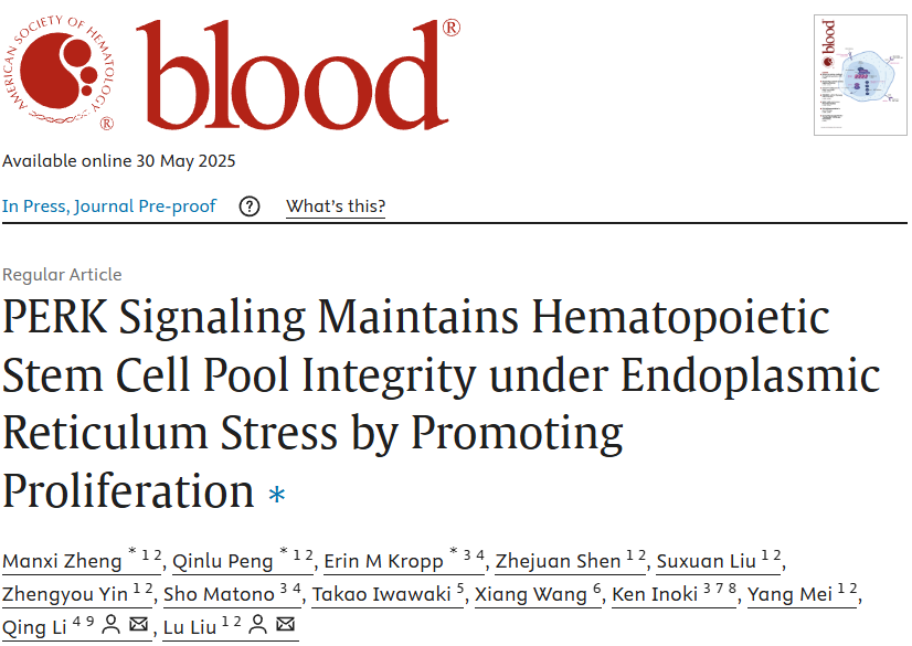 该研究不仅深化了对HSC群体完整性维持机制的理解,更重要的是,为进一步解析前白血病克隆扩增、白血病发生发展等病理过程中HSC群体完整性如何被破坏或维持提供了全新的视角和潜在的干预靶点。研究成果以“PERK Signaling Maintains Hematopoietic Stem Cell Pool Integrity under Endoplasmic Reticulum Stress by Promoting Proliferation”为题发表在血液权威期刊《Blood》。九游会j9官网登陆入口生命医学交叉研究院博士研究生郑蔓茜、彭沁露,密西根大学Erin Kropp为共同第一作者,九游会j9官网登陆入口刘禄教授、密西根大学李清为共同通讯作者。该研究工作得到了九游会j9官网登陆入口梅杨教授研究组、上海理工大学王翔等研究组的大力帮助。